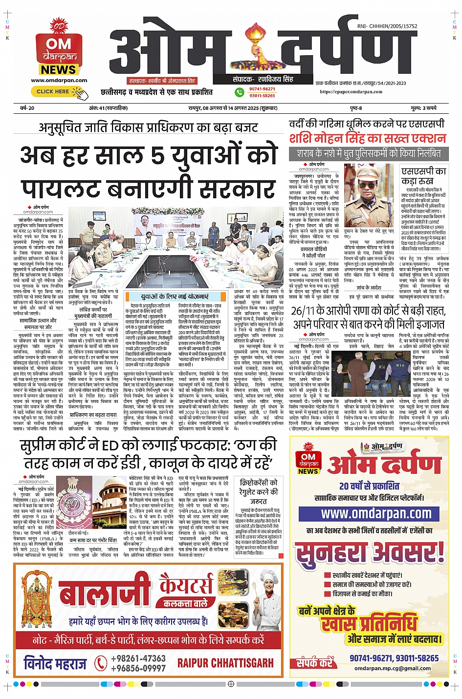 इस हफ़्ते के ओम दर्पण साप्ताहिक संस्करण में पढ़िए - रायपुर में स्मार्ट सिटी प्रोजेक्ट की नई प्रगति पर विशेष रिपोर्ट, राजधानी के मौसम का हाल और किसानों के लिए ज़रूरी सलाह, और इस सप्ताह की राजनीतिक और मनोरंजन की दुनिया की सभी बड़ी खबरें...