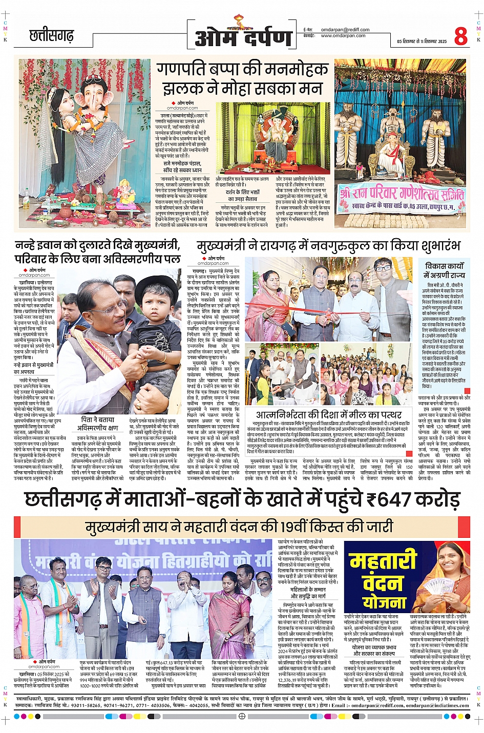 इस हफ़्ते के ओम दर्पण साप्ताहिक संस्करण में पढ़िए - रायपुर में स्मार्ट सिटी प्रोजेक्ट की नई प्रगति पर विशेष रिपोर्ट, राजधानी के मौसम का हाल और किसानों के लिए ज़रूरी सलाह, और इस सप्ताह की राजनीतिक और मनोरंजन की दुनिया की सभी बड़ी खबरें...