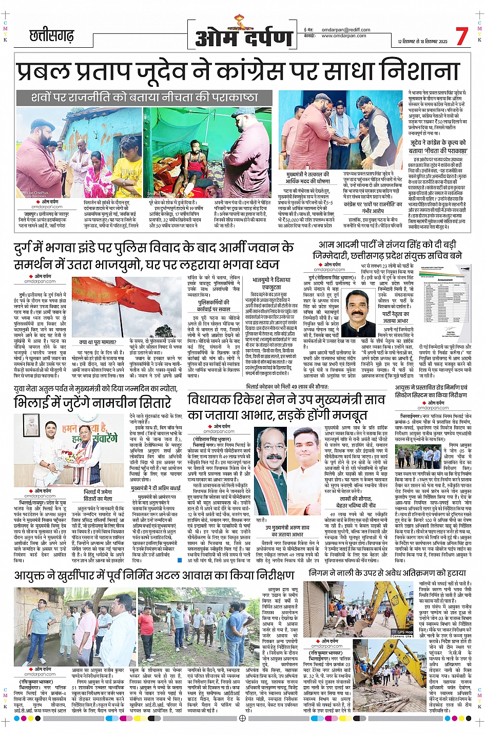 इस हफ़्ते के ओम दर्पण साप्ताहिक संस्करण में पढ़िए - रायपुर में स्मार्ट सिटी प्रोजेक्ट की नई प्रगति पर विशेष रिपोर्ट, राजधानी के मौसम का हाल और किसानों के लिए ज़रूरी सलाह, और इस सप्ताह की राजनीतिक और मनोरंजन की दुनिया की सभी बड़ी खबरें...