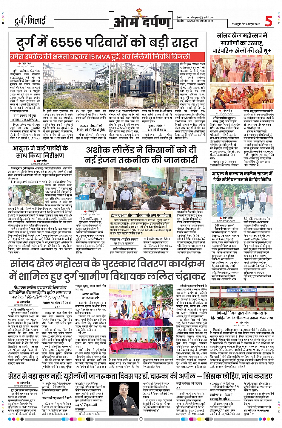 इस हफ़्ते के ओम दर्पण साप्ताहिक संस्करण में पढ़िए - रायपुर में स्मार्ट सिटी प्रोजेक्ट की नई प्रगति पर विशेष रिपोर्ट, राजधानी के मौसम का हाल और किसानों के लिए ज़रूरी सलाह, और इस सप्ताह की राजनीतिक और मनोरंजन की दुनिया की सभी बड़ी खबरें...