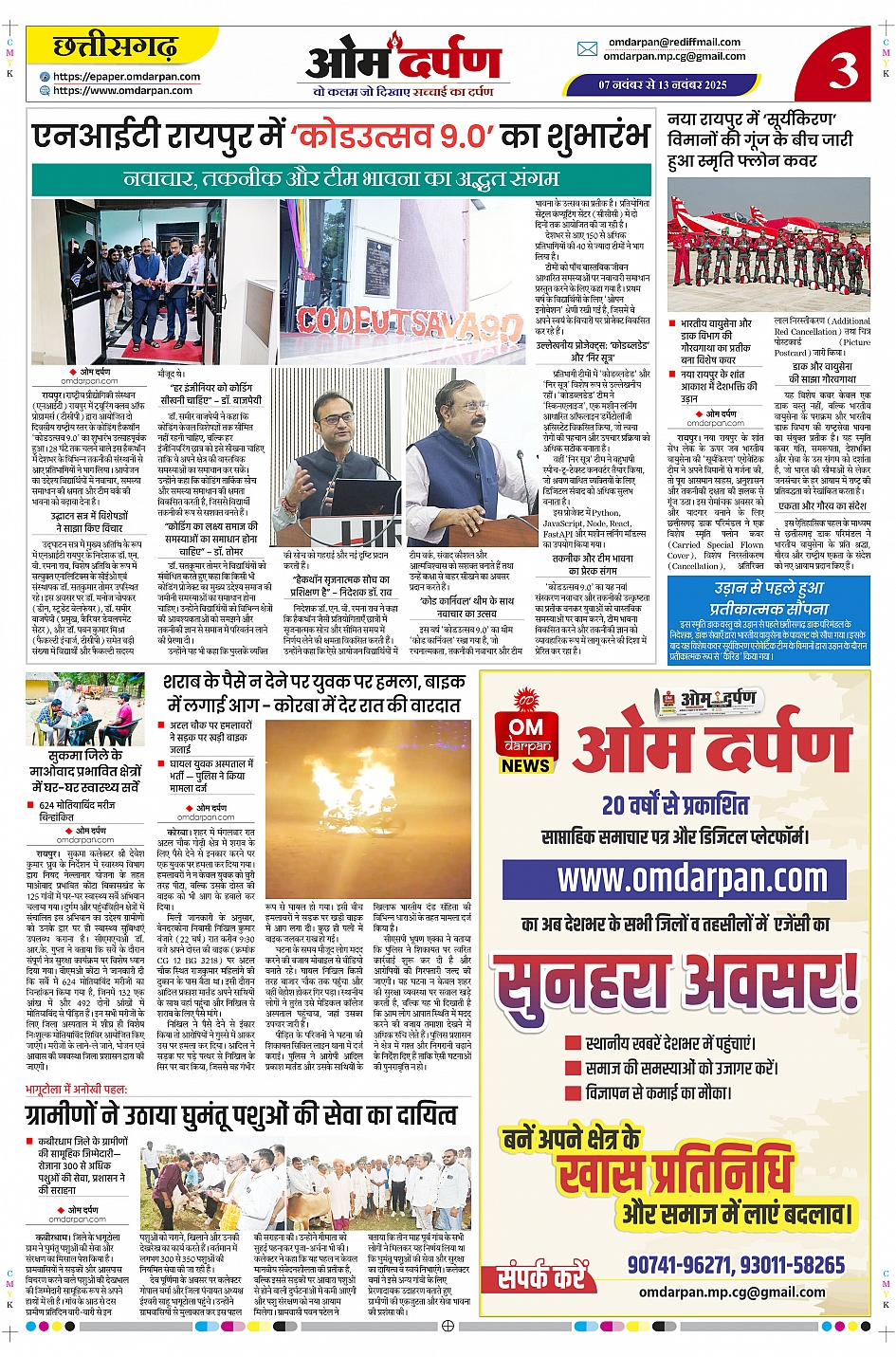 इस हफ़्ते के ओम दर्पण साप्ताहिक संस्करण में पढ़िए - रायपुर में स्मार्ट सिटी प्रोजेक्ट की नई प्रगति पर विशेष रिपोर्ट, राजधानी के मौसम का हाल और किसानों के लिए ज़रूरी सलाह, और इस सप्ताह की राजनीतिक और मनोरंजन की दुनिया की सभी बड़ी खबरें...