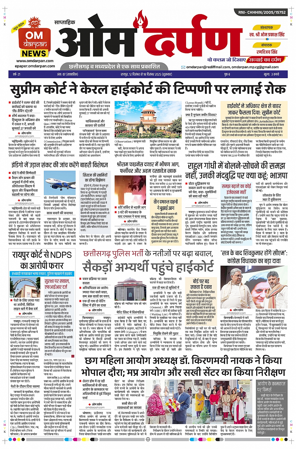 ओम दर्पण ई-पेपर – छत्तीसगढ़ का विश्वसनीय साप्ताहिक समाचारपत्र। आज का ताज़ा epaper ऑनलाइन पढ़ें। राजनीति, जिलेवार खबरें, रोजगार, शिक्षा, खेल और विशेष रिपोर्टों की PDF सप्ताह अपडेट।
