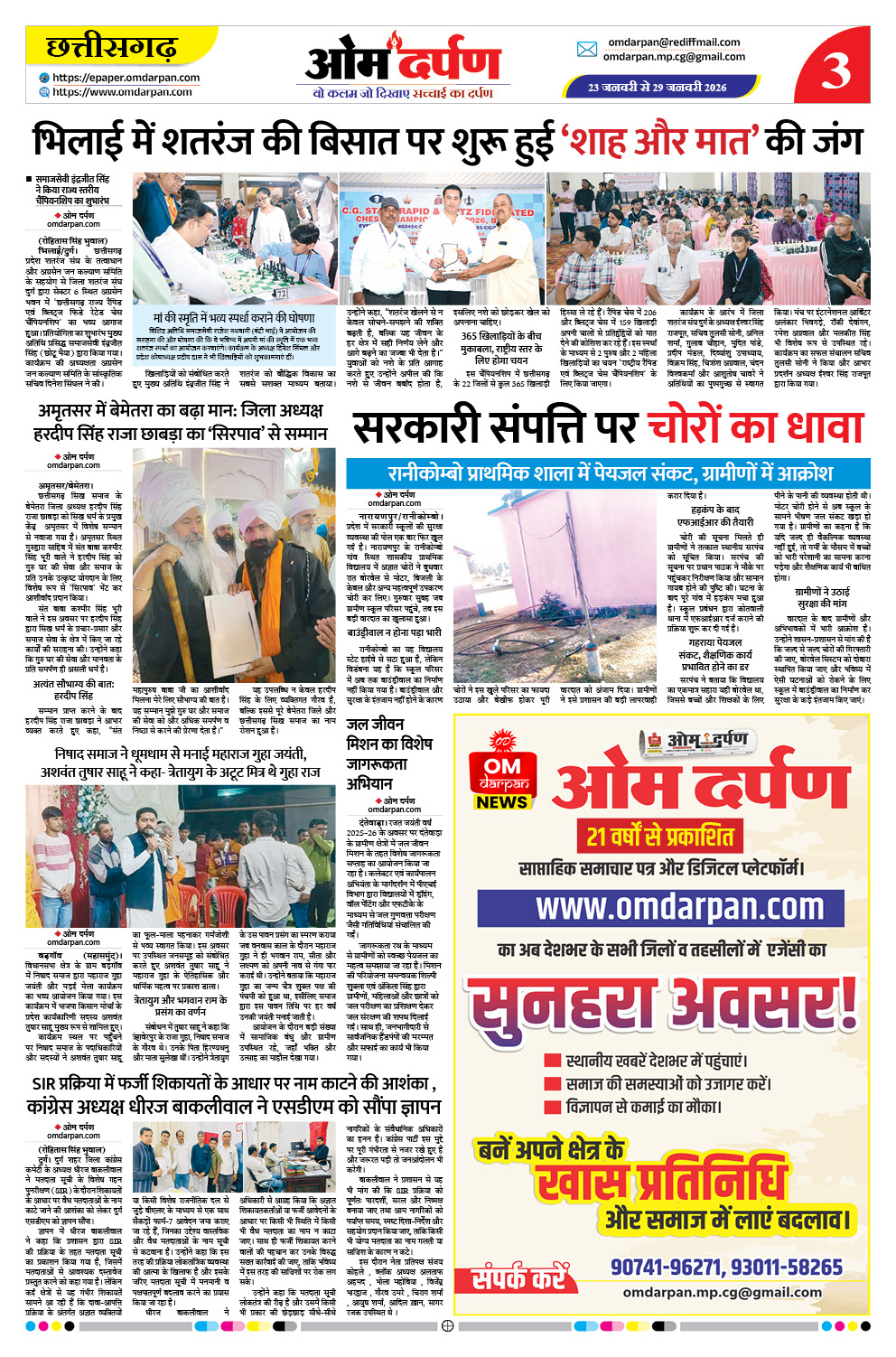 ओम दर्पण ई-पेपर – छत्तीसगढ़ का विश्वसनीय साप्ताहिक समाचारपत्र। आज का ताज़ा epaper ऑनलाइन पढ़ें। राजनीति, जिलेवार खबरें, रोजगार, शिक्षा, खेल और विशेष रिपोर्टों की PDF सप्ताह अपडेट।