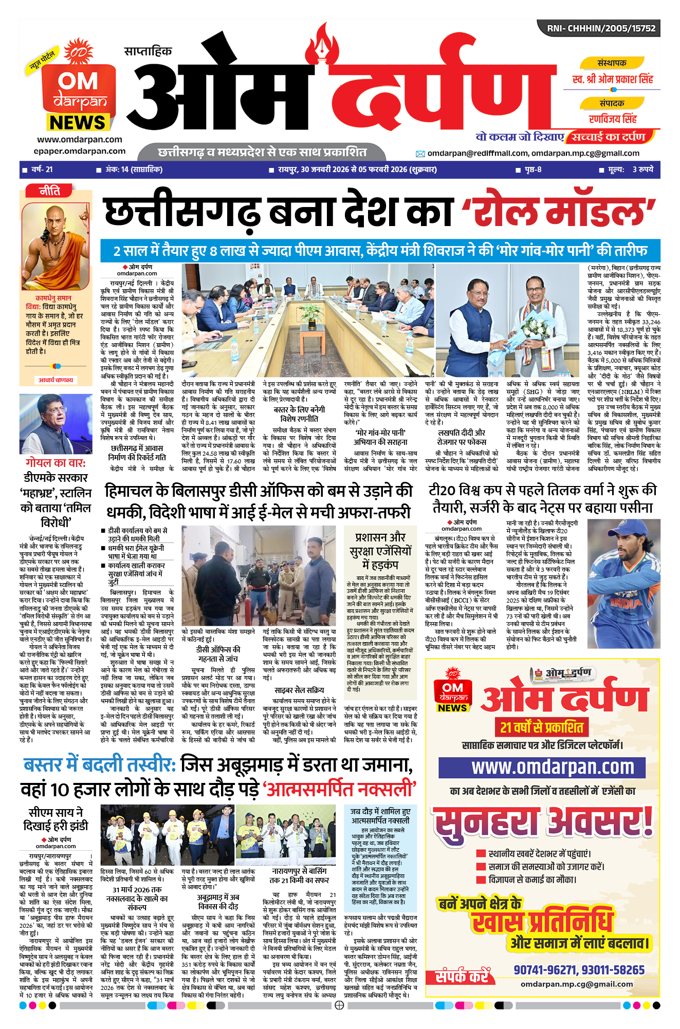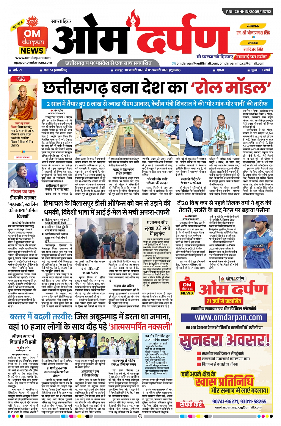 ओम दर्पण ई-पेपर – छत्तीसगढ़ का विश्वसनीय साप्ताहिक समाचारपत्र। आज का ताज़ा epaper ऑनलाइन पढ़ें। राजनीति, जिलेवार खबरें, रोजगार, शिक्षा, खेल और विशेष रिपोर्टों की PDF सप्ताह अपडेट।