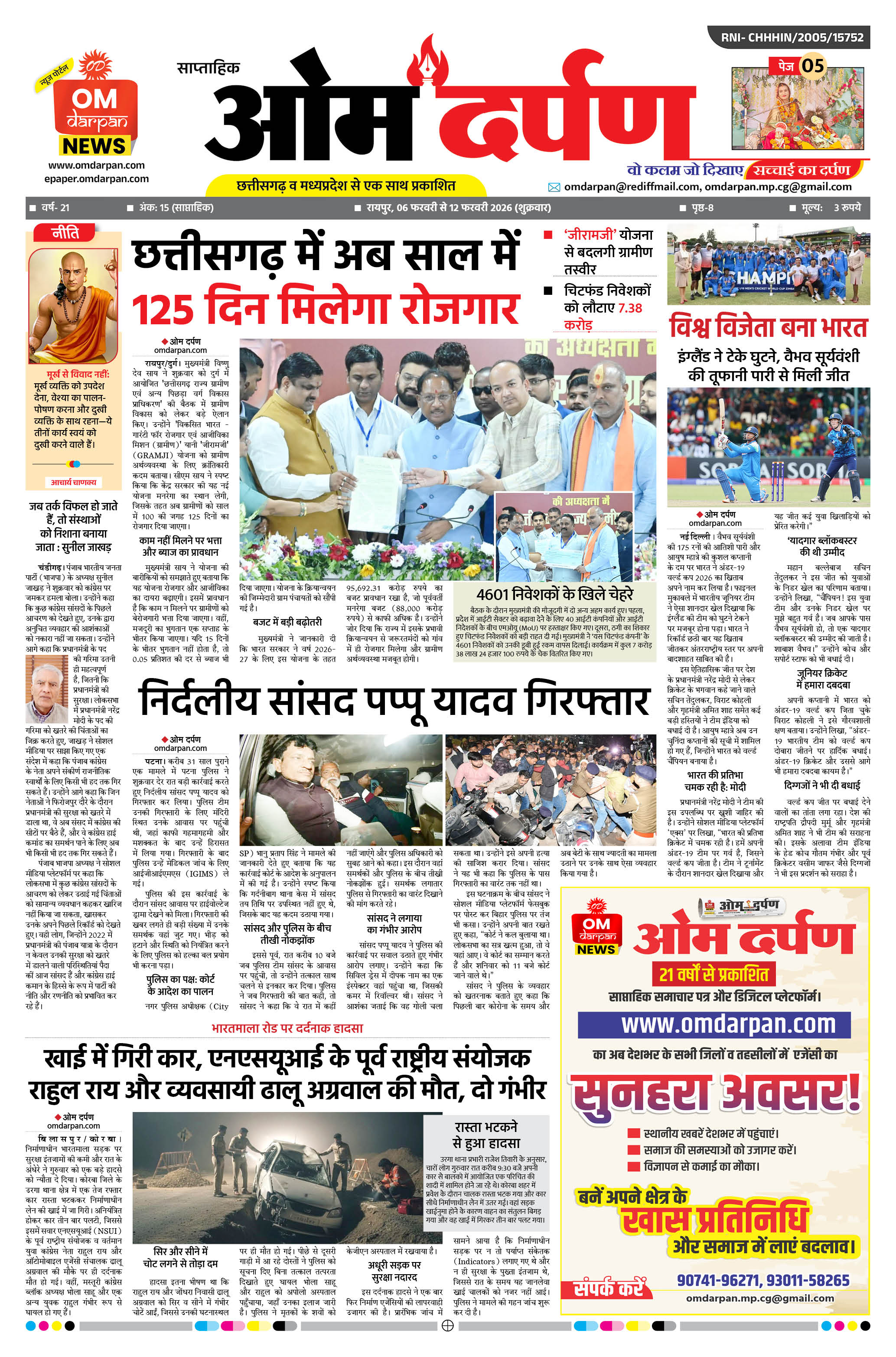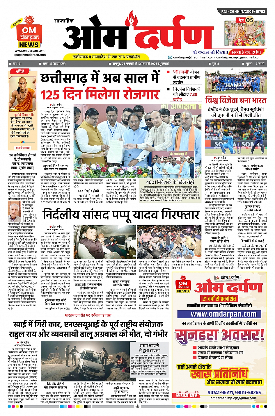 ओम दर्पण ई-पेपर – छत्तीसगढ़ का विश्वसनीय साप्ताहिक समाचारपत्र। आज का ताज़ा epaper ऑनलाइन पढ़ें। राजनीति, जिलेवार खबरें, रोजगार, शिक्षा, खेल और विशेष रिपोर्टों की PDF सप्ताह अपडेट।